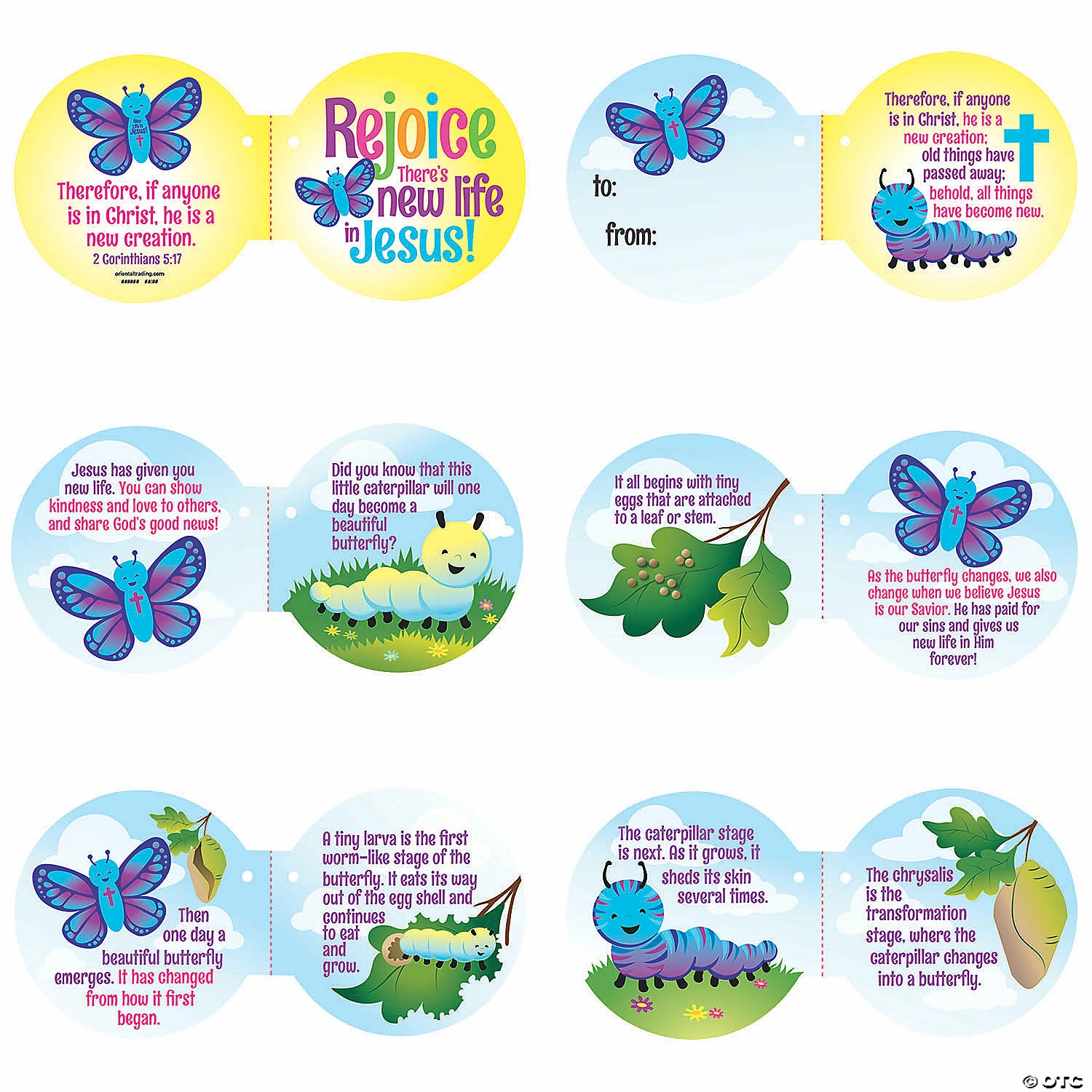 These cute plush butterfly toys take on new meaning when you consider the transformation of the caterpillar to the butterfly — much like how we change when we believe that Jesus is our Savior! Add these cute religious toys to Sunday School giveaways and VBS handouts for little believers. Plush. Butterfly, 5 1/4″; cardstock story, 2 3/4″ diam. 12 pgs. with To/From space. © OTC